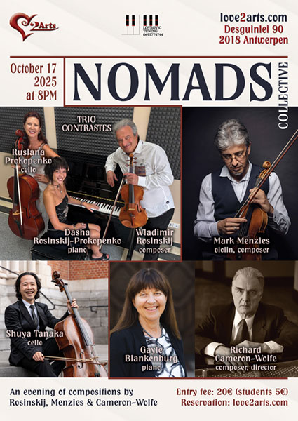 Concert by Nomads on October 17, 2025 at 8pm, including the premiere of Rosinskij's cello duo "Zwei-fel(l)".