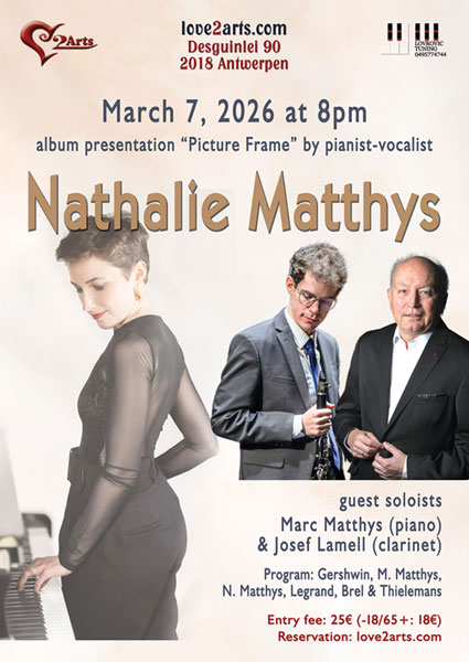 Album presentation "Picture Frame" — Concert by Nathalie Matthys (piano and vocals) featuring guest soloists Marc Matthys (piano) and Josef Lamell (clarinet) on March 7, 2026 at 8pm.