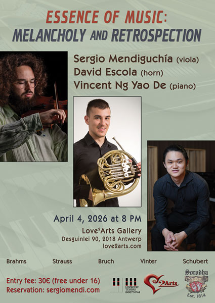 "Essence of music: Melancholy and restrospection" — Concert by Sergio Mendiguchía (viola), David Escola (horn) and Vincent Ng Yao De (piano) on April 4, 2026 at 8pm.